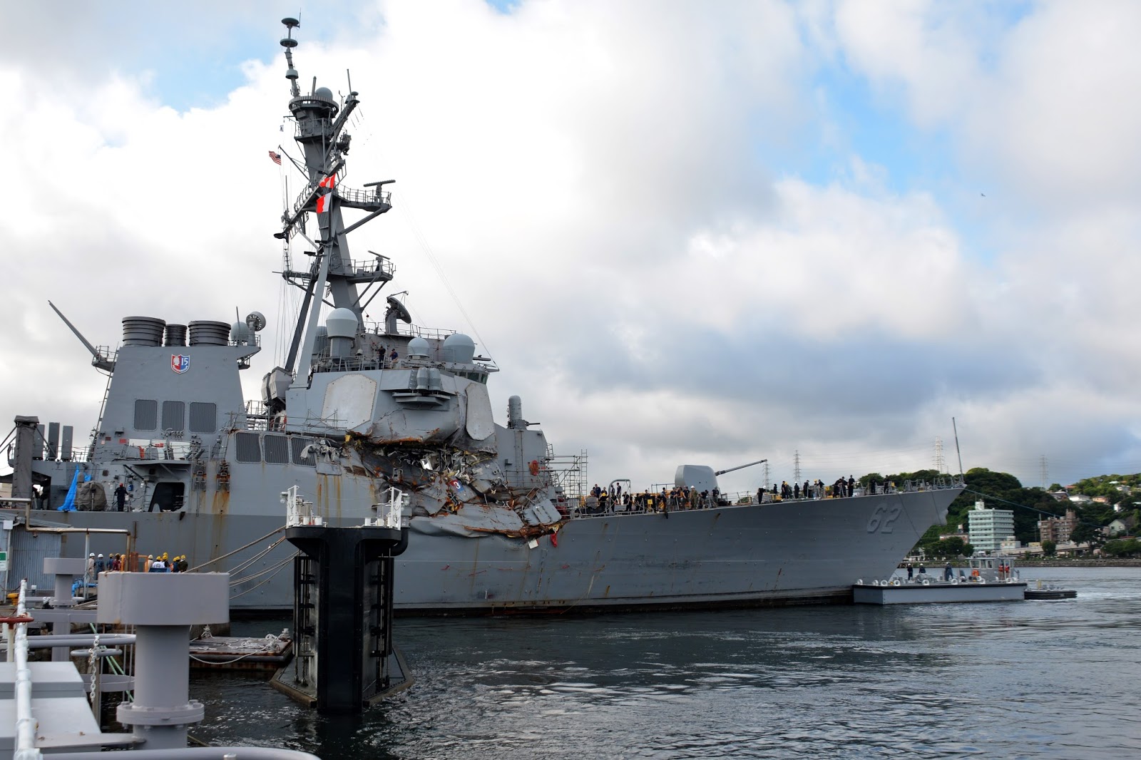 | YOKOSUKA, Japan (July 11, 2017) The Arleigh Burke-class guided-missile destroyer USS Fitzgerald (DDG 62) moves into Dry Dock 4 at Fleet Activities (FLEACT) Yokosuka to continue repairs and assess damage sustained from its June 17 collision with a merchant vessel. FLEACT Yokosuka provides, maintains, and operates base facilities and services in support of U.S. 7th Fleet's forward-deployed naval forces, 71 tenant commands and 26,000 military and civilian personnel. (U.S. Navy photo by Mass Communication Specialist 1st Class Peter Burghart/Released) |
